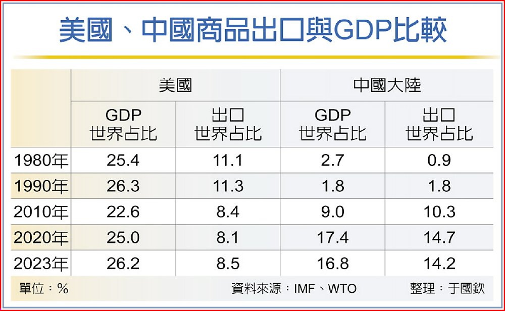 沒錯,就商品貿易而言,美國已由世界最大出口國,落至如今的第二,商品出口的世界占比也由高峰時的14.7%降至近年的8.5%,若只看這個數字,會覺得在自由貿易之下,美國貿易版圖為人所奪,然而,如同前面所說的,商品貿易只是GDP的一小部分,要看美國有沒有吃虧,得看GDP的世界占比。