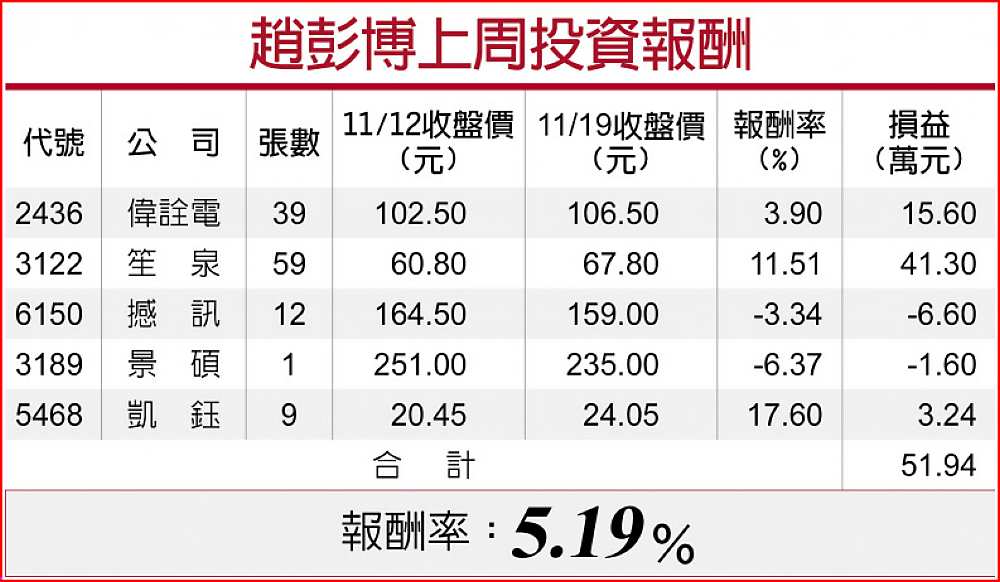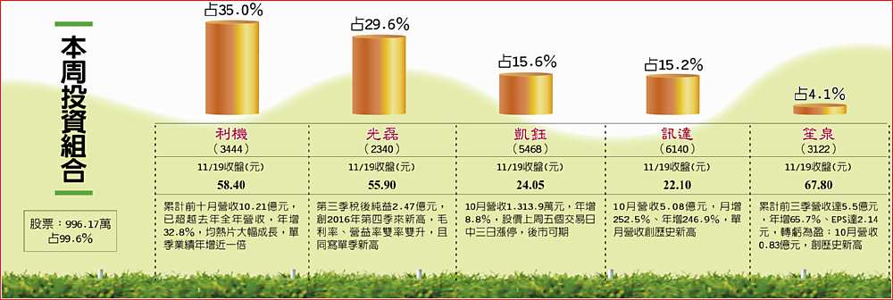台股上周以「小碎步」方式前進「萬八」,證券分析師趙彭博指出,在台股財報空窗期之際,預期明年業績成長之個股,上漲機率較高,投資人可優先選擇外資、投信認養之績優股。本周投資組合前兩大為利機(3444)、光磊(2340),再選入凱鈺(5468)、訊達(6140)與笙泉(3122)。