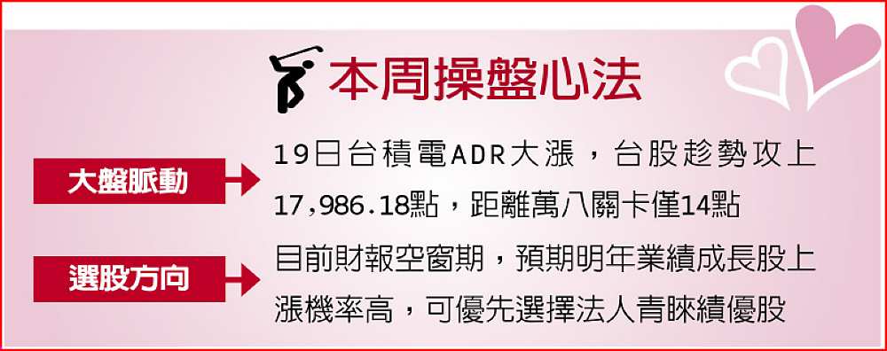 台股受惠美股翻揚上漲,也朝「萬八」目標前進,上周前四個交易日均以「小碎步」方式向前邁進,直至19日又趁台積電ADR大漲3.64%的勢頭,一舉攻至17,986.18點,距離「萬八」重要心理關卡僅剩14點,距離18,034點歷史高點也不到50點。