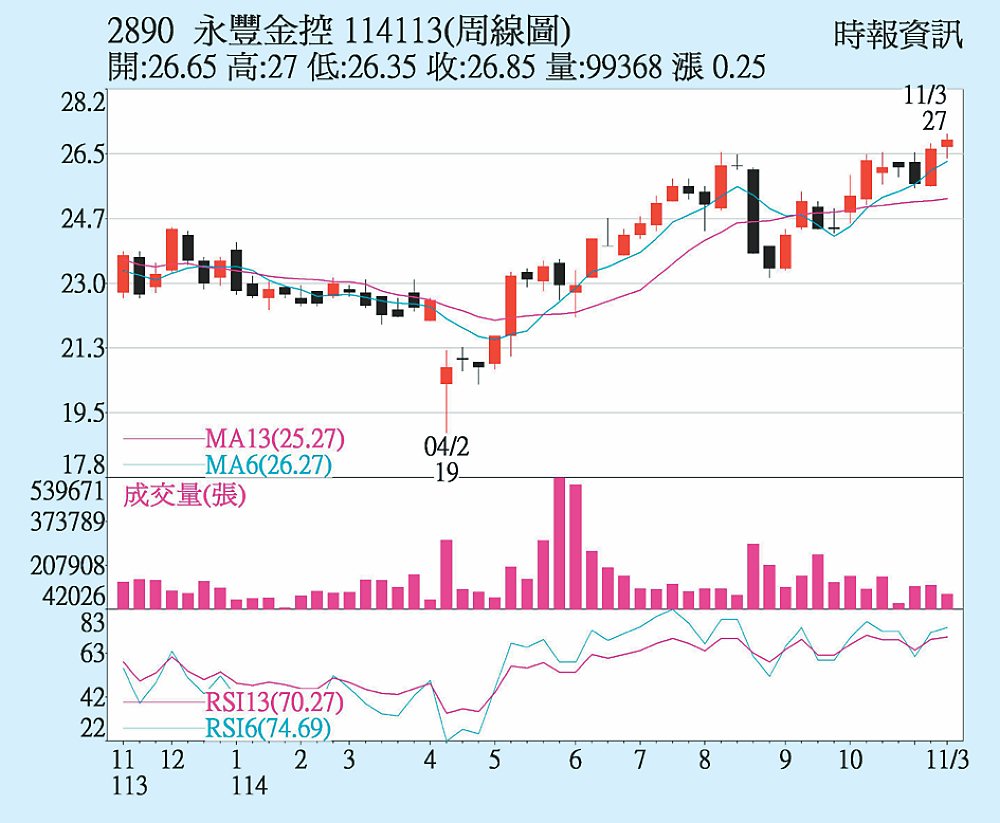 永豐金14日股價收在26.85元,上漲0.05元或0.18%,整周上漲近1%;三大法人本周全站買方,合計買超4萬0,300張,其中外資買超3萬7,152張、投信買超1,522張、自營商買超1,625張。技術線型觀察,永豐金目前股價在所有均線之上,基本面獲利支撐下,後續表現可期。