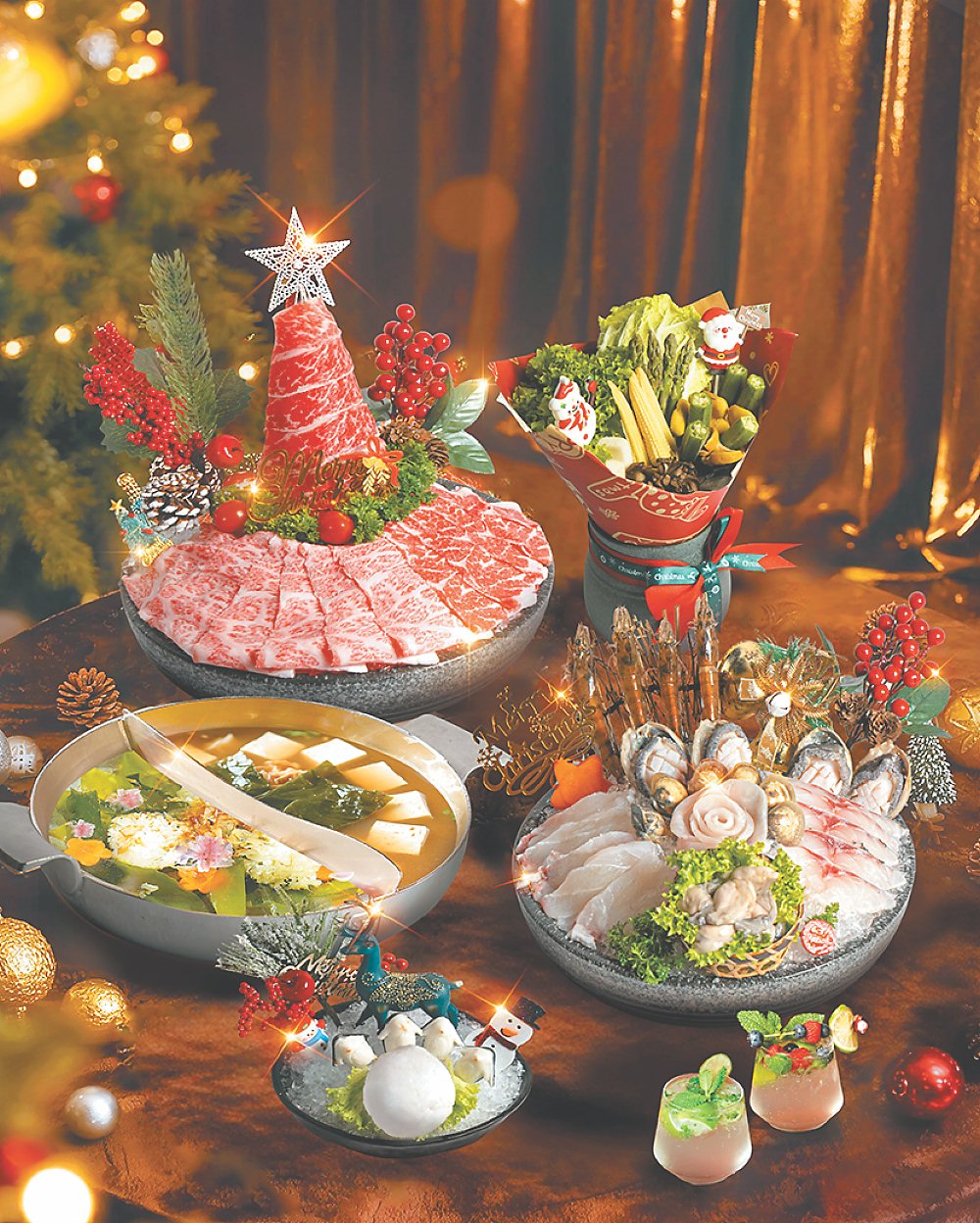 本季節慶餐桌集結「皇牌鹿兒島和牛三拼肉肉聖誕樹」、「波士頓活龍蝦三重奏」與「活蛤鮮雞爆炒香鍋」等核心菜色,從頂級肉品、海陸珍饌、現炒鍋底到獨創和風醬料,展現湊湊於歲末期間在食材層次與料理手法上的多元樣貌。全系列嚴選高品質食材,並以懷石料理取向為基礎,讓食材本身的質地與旬味得以藝術方式呈現。