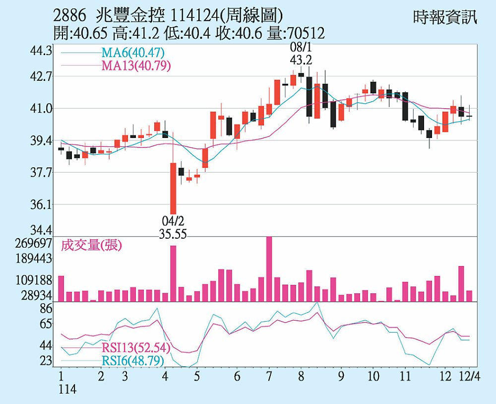 兆豐金26日股價下跌0.1元,收在40.6元,與上周持平;三大法人本周合計賣超10,941張,其中,外資賣超18,257張、投信買超6,290張、自營商買超1,026張。技術線型觀察,兆豐金目前股價在周線、月線及季線下,短線量能萎縮,後續觀察基本面表現,全年獲利能否重回成長軌道。