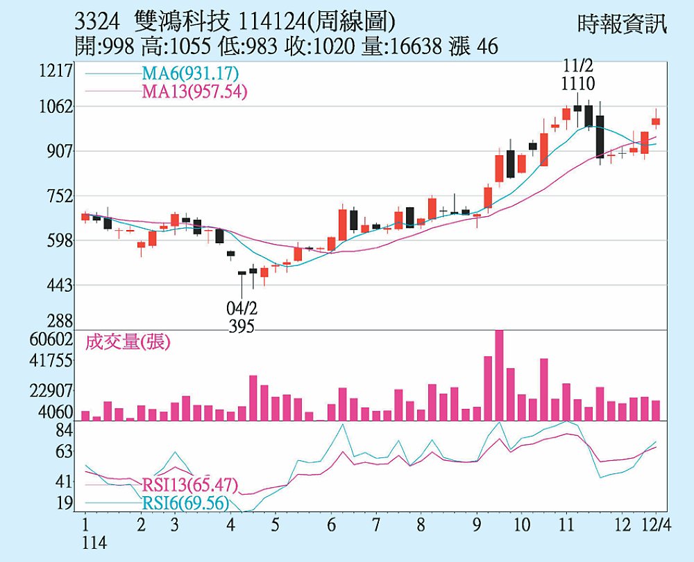 雙鴻(3324)上周收在1,020元,周漲幅4.72%,高檔震盪仍回歸千金股行列,更站穩在短中期均線之上,惟周成交量收斂至1.6萬張。三大法人上周買超2,371張,其中外資買超1,598張,投信買超592張,自營商買超181張,目前多數技術指標仍處於偏多格局。