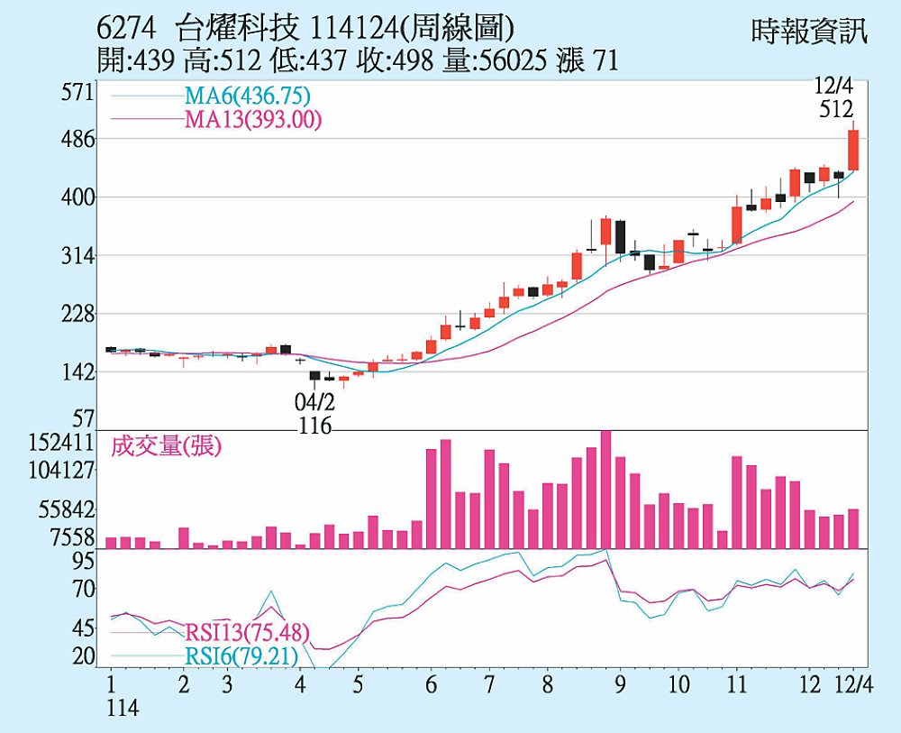 CCL大廠台燿(6274)受惠AI伺服器層數與材料規格升級及切入美系AI ASIC,帶來成長動能,近一周股價大漲16%,26日盤中一度衝至512元,終場收平盤498元。三大法人近五日合計買超1.15萬張,顯示法人高度看好其成長潛力。