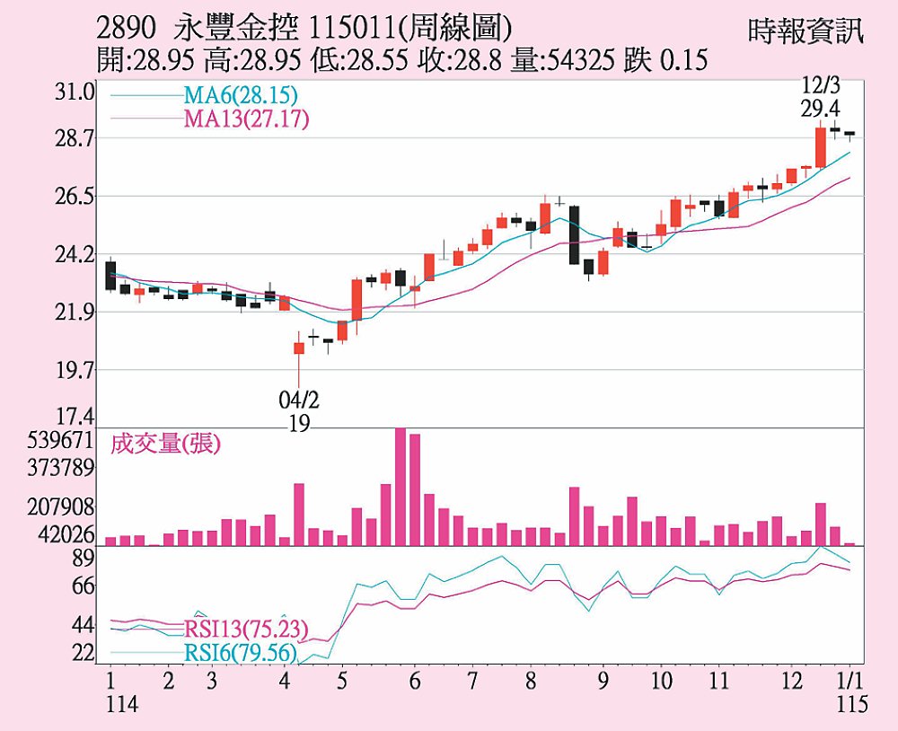 永豐金2日股價收在28.8元,上漲0.2元或0.69%,全周下跌近0.52%;三大法人本周合計賣超8,610張,其中外資賣超8,662張、投信賣超284張、自營商買超336張。技術線型觀察,永豐金目前股價在周線之下、月線之上,短線偏震盪整理,基本面獲利亮眼,後續觀察法人動向。