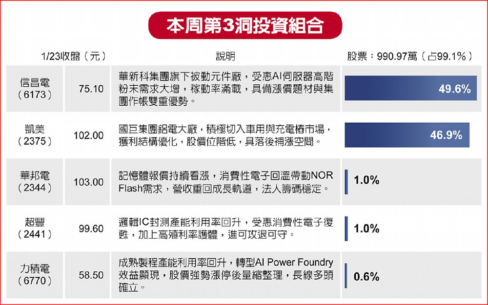 台股上周經歷一場教科書等級的「壓力測試」與「V型反轉」。加權指數先是在前半周創下歷史新高,隨後於上周三遭遇超過500點的技術性修正,最後在上周四與23日由大型權值股領軍強勢收復失土。摩爾投顧分析師鐘崑禎最新選股挑入信昌電(6173)、凱美(2375)、華邦電(2344)、超豐(2441)、力積電(6770)五檔。