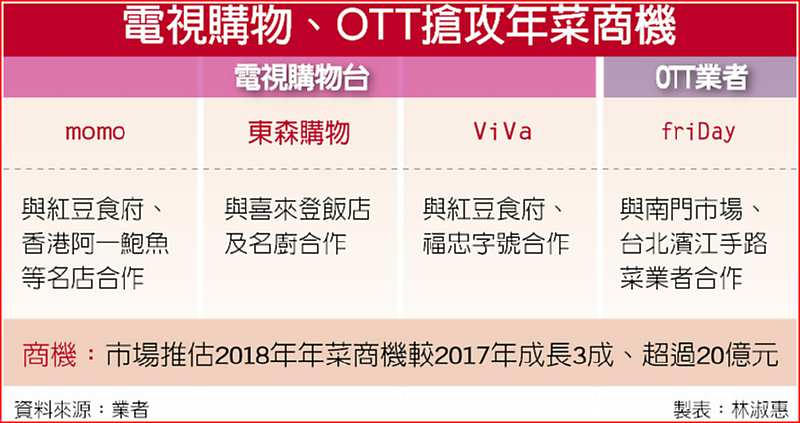 搶年菜外送商機,電視購物台業者今年擴大與飯店合作,電信公司開設的OTT平台、今年也加入販售年菜外賣服務行列。業者樂觀預估,今年整體年菜及相關年節、年貨商機將比2017年成長3成,其中,年菜市場商機估超過新台幣20億元。