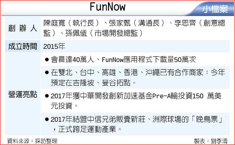 FunNow 2017年的營收與2016年相比,年成長四倍。展望2018年,陳庭寬表示,2018全年營收預計可達8億元至10億元,且將開始獲利。