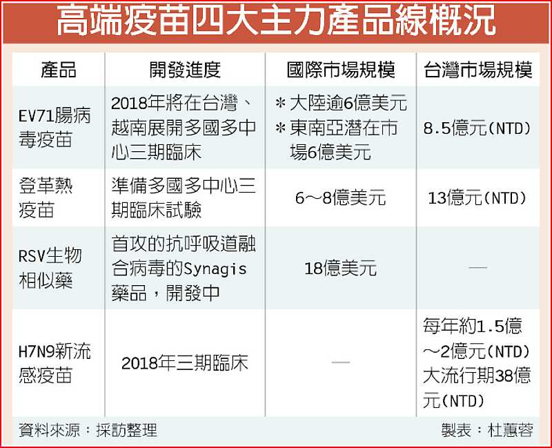 高端疫苗(6547)受惠疫苗產業興起,四大主力產品中的腸病毒EV71、H7N9模擬疫苗和登革熱疫苗等3項產品已準備進入第三期臨床試驗,有機會拚2020年取證,營運轉盈。高端總經理陳燦堅表示,目前積極布局海外市場,以東協為灘頭堡,將以疫苗廠輸出、專案授權或合作研發為方向。