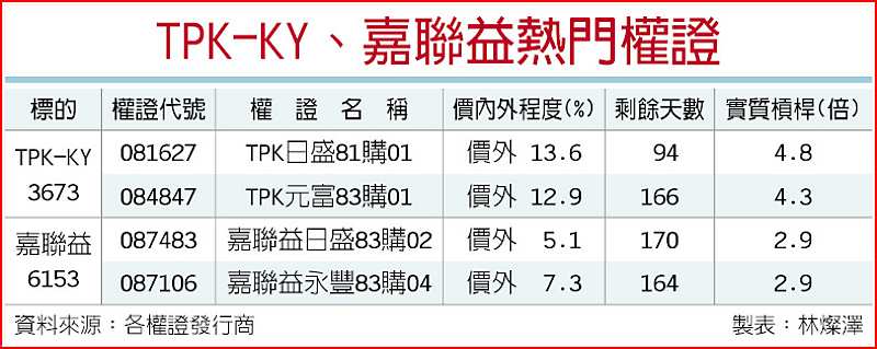 TPK-KY(3673)、嘉聯益(6153)獲法人買盤加持,TPK-KY有外資及自營商1日買超2,823張,股價收高57.5元大漲9.73%,嘉聯益有本土兩法人投信及自營商買超2,800餘張,股價收41.55元勁揚6.27%,使得相關認購權證炙手可熱。