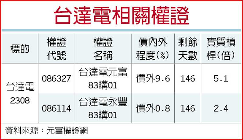 元富新金融商品部提醒投資人,若看好台達電未來發展,可選擇長天期,價內外程度15%、買賣價差小的權證,進一步選擇委買委賣價差小,選擇優良券商所發行的權證。(元富證券提供 陳昱光整理)