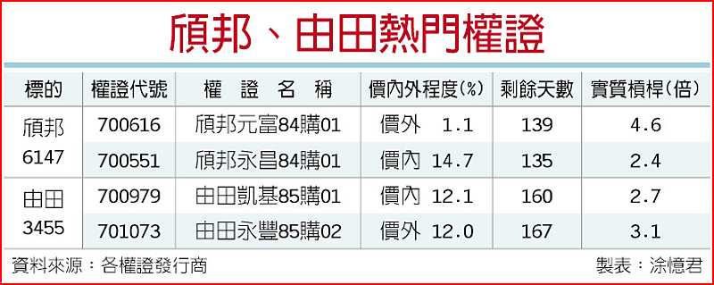大盤指數歷經周一奔漲,昨(4)日出現整理拉回,然頎邦(6147)、由田(3455)明年動能十足,不畏盤勢震盪續漲3.44%、2.47%,權證市場認購權證交投同步熱絡。