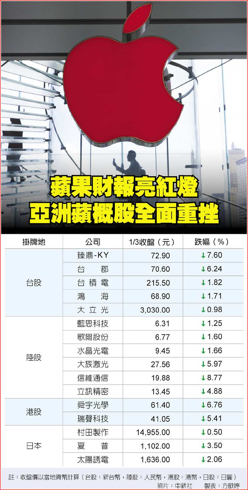 蘋果(AAPL)2019年甫開春自爆調降財測利空,亞洲重量級蘋概股包括台積電、立訊精密、夏普、舜宇等昨(3)股價同步走跌,合計市值蒸發逾3,000億元,台積電單日縮水1,037.2億元最鉅。