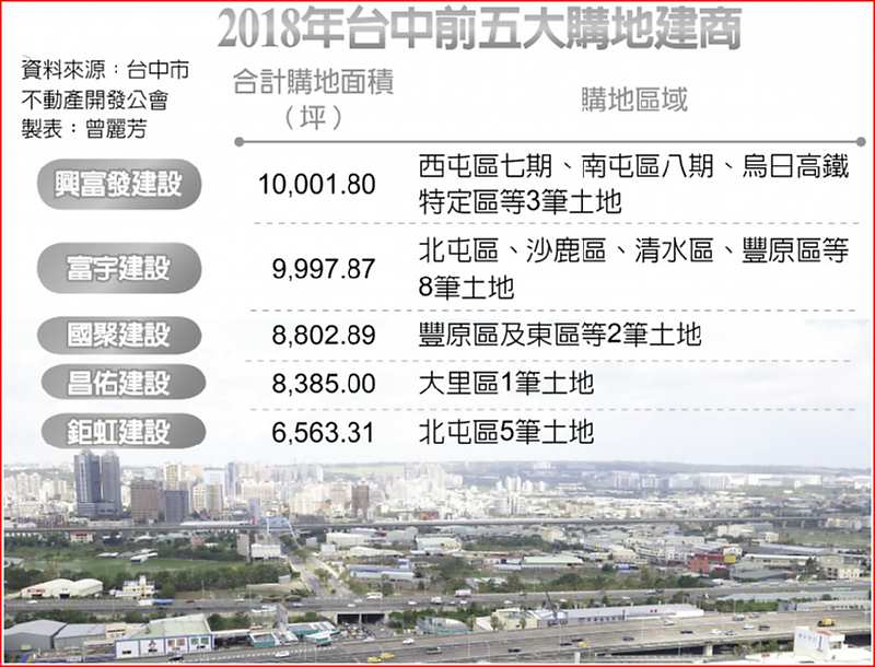 台中房市買氣夯,建商瘋搶地!根據台中市不動產開發公會統計資料顯示,2018年建地面積超過450坪的土地,總共成交136筆,合計土地面積高達16萬3,680坪。其中,台中市前五大搶地建商,第一名為興富發建設,購地面積超過1萬坪;二、三名分別是富宇建設與國聚建設,購地面積皆近萬坪,都將於今年推出大面積住宅開發案。