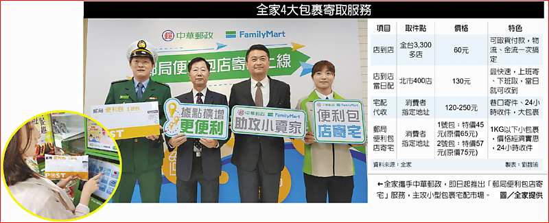 瞄準全民電商時代,全家便利商店9日宣布與中華郵政聯手,創全台通路之先推出「郵局便利包店寄宅」服務,主攻小型包裹宅配市場,24小時寄件不打烊。民眾再也不用受限郵局營業時間,到全家隨時可寄件。市場預料全家和中華郵政強強聯手,將掀起新一波通路物流服務大戰。