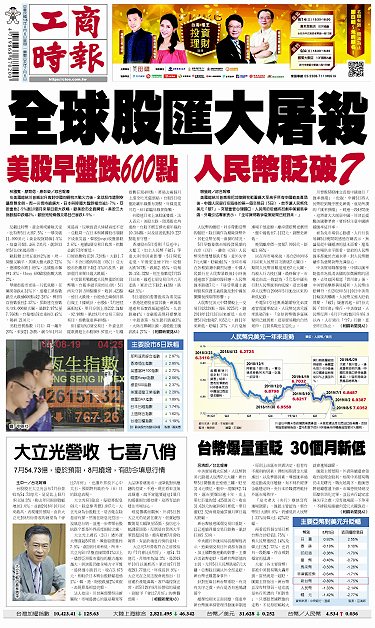 大立光營收 七喜八俏 7月54.73億,優於預期,8月續增,有助今填息行情 台幣爆量重貶 30個月新低 全球股匯大屠殺 美股早盤跌600點 全球股匯大屠殺 人民幣貶破7