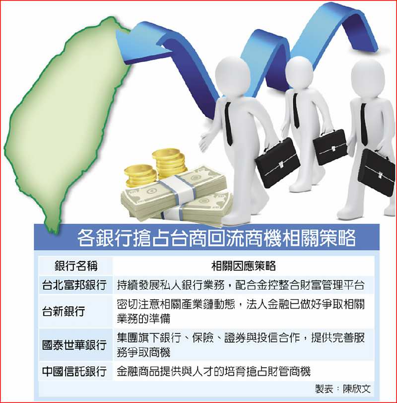 銀行業者大搶台商回流引爆的財富管理商機。台新金控總經理林維俊27日在法說會表示,將密切關注海外資金回流台灣,積極爭取各項業務的機會。根據經濟部揭示的資訊,截至目前已有近120家台商回台投資,金額逾5,600億元,對這波台商回流將帶動相關產業鏈的動能,台新銀行法人金融已做好爭取相關業務的準備。
