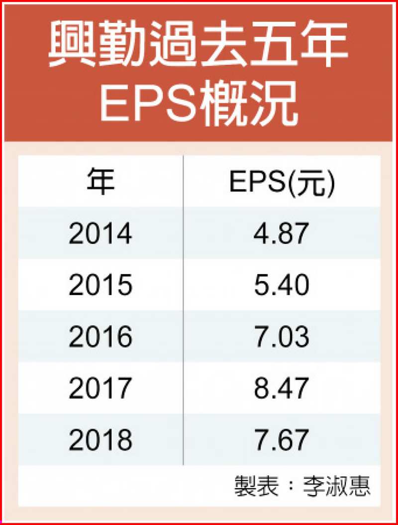 興勤2018年受營業稅率從17%調升至20%影響,2018年EPS落在7.67元,仍是歷史次高紀錄,僅次於2017年8.47元。