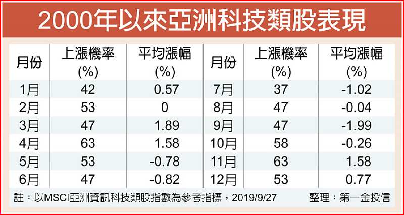 根據統計,2000年以來,MSCI亞洲資訊科技類股於第4季各月的上漲機率約6成左右,為全球勝率最高的季度。而若以漲幅來看,10月平均小跌0.26%,不過,11月平均漲幅即達1.58%,而且漲勢一路延續到隔年4月。