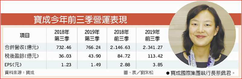 在上述各項營運表現助威下,寶成今年前三季稅後淨利113.42億元、年增33.9%,EPS為3.85元,優於去年同期的2.88元。