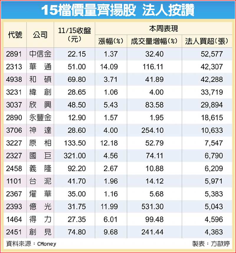 據統計,包括中信金、華通、和碩、緯創、欣興、永豐金、神達、原相、國巨、義隆、台泥、燿華、億光、得力、創見15檔本周獲法人青睞,周買超4,363~52,577張不等,行情逆勢呈現價量均揚,技術線型則與大盤齊步居5日線上。