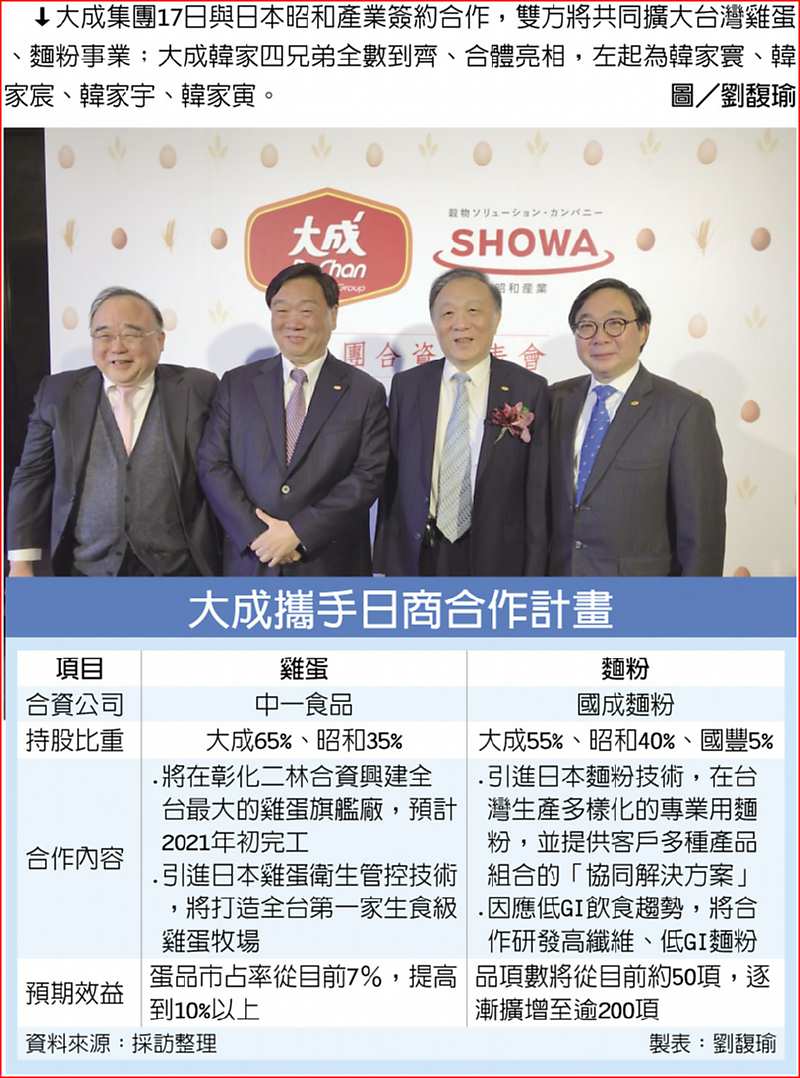 韓家宇說,大成此次跟昭和合作,期望能有突破性的發展,帶動台灣雞蛋、麵粉產業更上層樓。昭和產業社長新妻一彥也說,雙方在大陸合作已取得好成績,未來希望不僅在台灣,也有機會往東南亞等海外市場發展。