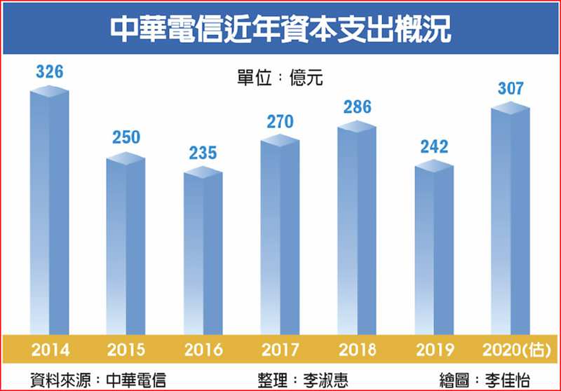 為搶5G首發商轉開台商機,中華電信加速5G網路建設,22日公布2020年資本支出新台幣307億元,創近六年來新高。