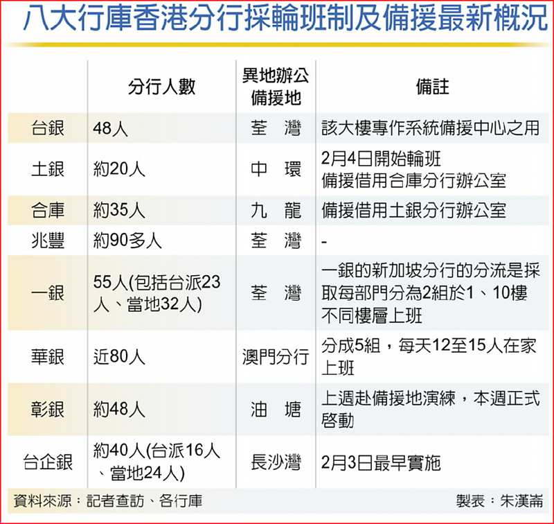 根據最新調查結果,本周起八大行庫已全面對香港分行採取輪班制,除了華銀採取五班,其他行庫採兩班制,並且必要時「異地辦公」的備援中心也準備到位。其中,台企銀的香港分行從2月3日就開始採取AB兩班分流制,是最早的一家;土銀、台銀也在上周開始;本周一起,全體行庫已開始一致採取輪班制。