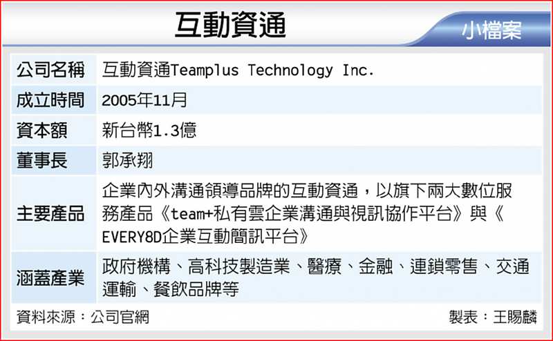 新冠肺炎疫情持續,視訊軟體、遠端辦公、線上教學等應用需求大漲,本土私有雲企業即時協作領導品牌team+、互動資通創辦人暨董事長郭承翔指出,team+目前服務的各產業客戶中,具有跨國溝通需求的比重接近80%,為維持防疫期間的正常營運,相關的採購需求初步估計增加三成。