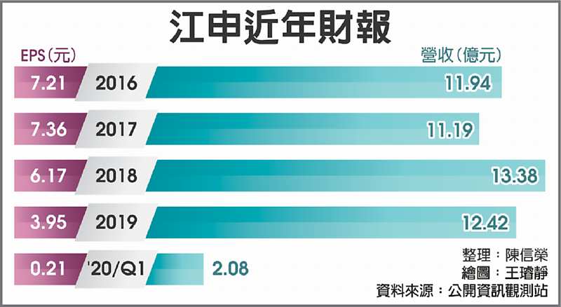 但江申指出,去年受到大陸車市下滑、客戶要求降價衝擊,及股利政策改變須認列遞延所得稅等因素,使江申去年稅後淨利僅2.9億元、年減36%,EPS為3.95元,降至金融海嘯以來新低;今年首季更因新冠肺炎疫情爆發,大陸全面延後開工,江申大陸事業營運停滯,首季EPS剩0.21元、年減85%。