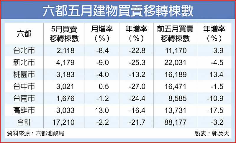 根據六都地政局1日所公布的建物買賣移轉棟數,除台中約持平,以及高雄因橋頭、仁武等地有新建案交屋而較上月有13%成長外,其餘四都5月交易動能均較4月衰退,與去年同期相較,六都普遍衰退13~27%,主要因去年5月正值房市旺季交易熱絡,墊高基期所致。