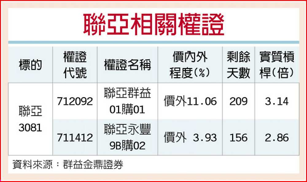 大盤緩步震盪上揚格局,23日指數站上11,600點,收11,612.36點小紅;光通訊模組廠聯亞(3081)震盪收293.5元、漲幅0.34%與大盤相當,盤中295元為波段新高價,也帶動相關權證交投熱絡,今(24)日除息後的填息行情,有待進一步觀察。