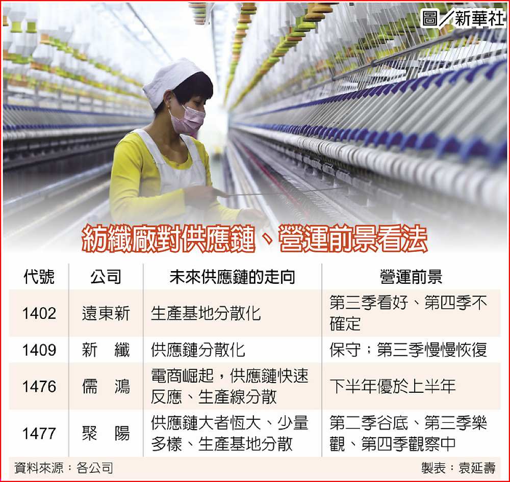 新冠疫情對全球紡織產業的傷害前所未見,包括新纖董事長吳東昇、儒鴻董事長洪鎮海、聚陽董事長周理平都指出,此次疫情已改變產業供應鏈,及客戶與供應商的互動生態。後疫情時代的供應鏈將趨於生產基地分散化、採購更集中化、訂單快速反應及少量多樣化。