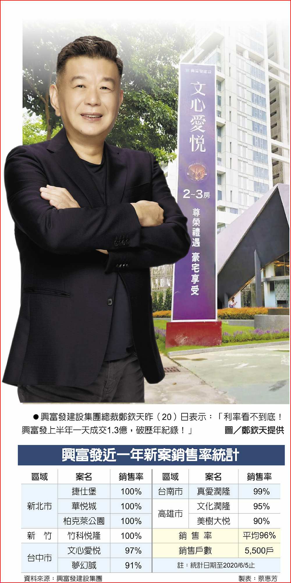 興富發建設集團總裁鄭欽天20日表示,超低利帶動小宅旋風,這波房市成長動能最主要是利率太低,頗有引爆房市的意味;興富發建設集團九大新案近一年已橫掃全台5,500戶,比往年同期翻倍,平均銷售率高達96%,為歷年之最,興富發上半年以來一天平均成交1.3億,也打破歷年紀錄!