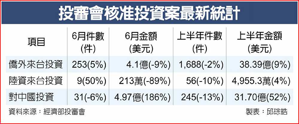 我對大陸投資方面,上半年核准對中國大陸投資件數為245件、年減13.12%,核准投資金額為31.7億美元、年增52.49%,主因去年上半年基期較低所致。