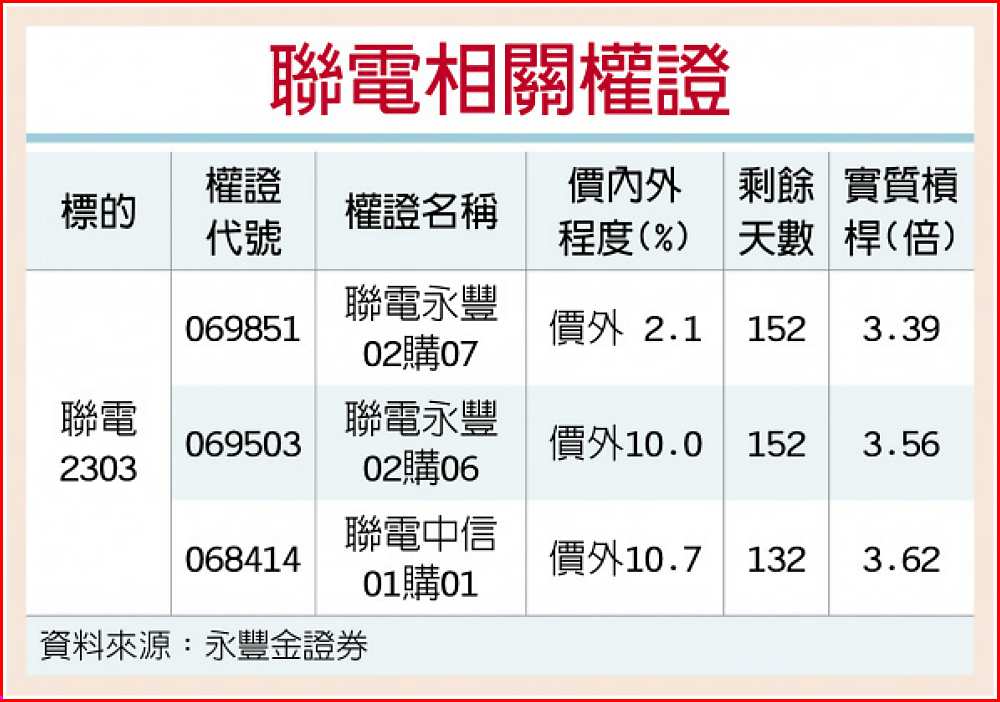 外資預期,聯電第四季起8吋晶圓價格將調漲一成,今年至後年每股盈餘可望逐年走揚。加上聯電受惠三星智慧型手機市占率提升,調高聯電投資評等至「加碼」,目標價自22.8元上修至28.5元。國內法人則上修聯電今年與明年每股盈餘預估值3%及18%,來到1.5元及1.9元,提升投資評等至「買進」,同時調升目標價至每股35元。