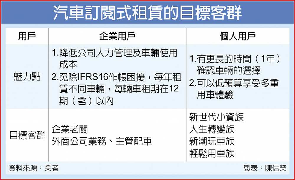 和運租車總經理謝富來表示,企業用戶採用訂閱式租賃,除可以降低人力管理與車輛使用成本外,針對新版會計準則IFRS16,採用訂閱式租賃每年租賃不同車輛,每輛車的租期控制在12期(月)以內,可免除作帳的困擾,對於企業主、外商公司業務、主管配車,相當合適。