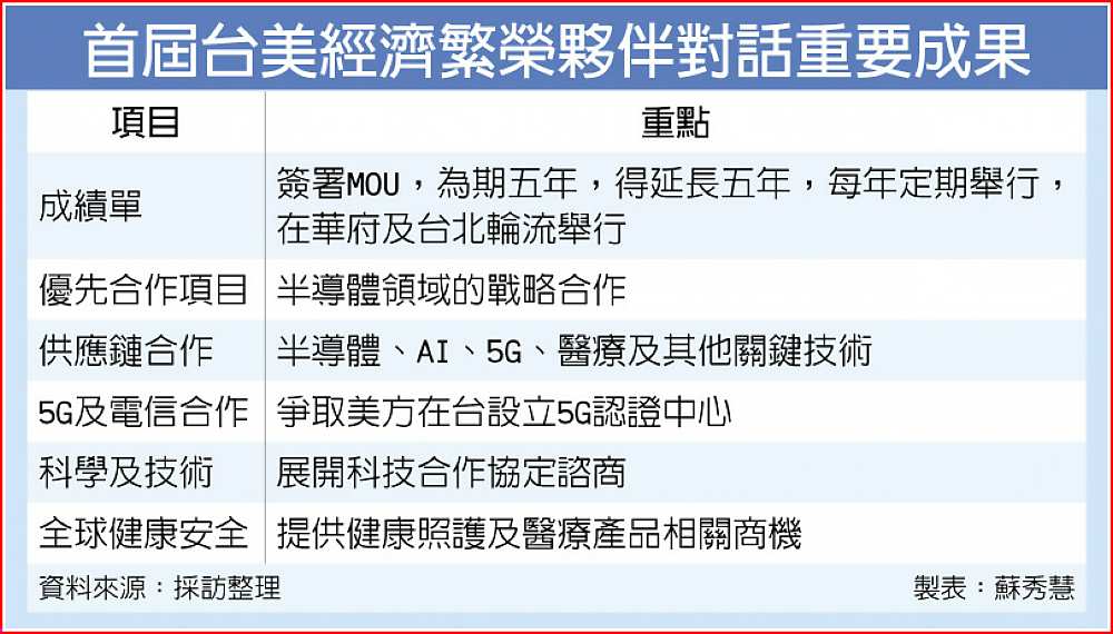 王美花指出,雙方均認為台灣在高科技硬體製造具競爭優勢,而美國在全球高科技產業扮演領導角色,基於半導體產業將為雙方經濟帶動重大且長期的利益,因此確認將半導體領域的戰略合作,列為優先項目。