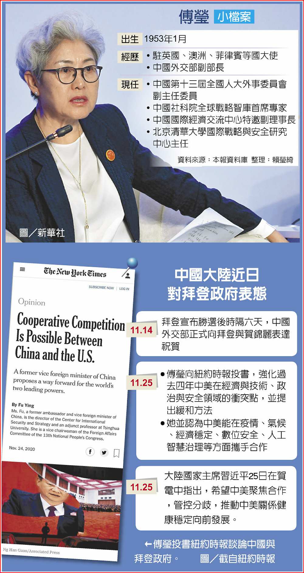 在美國總統當選人拜登公布首波新內閣名單後,大陸外交部前副部長、現任中方外交智囊的傅瑩25日隨即投書紐約時報,呼應美方所提出的兩國可建構競合關係,並從台海及南海爭端議題提出建議,為了避免誤解和意想不到的衝突,兩國軍方可以在戰略層面開展對話,以建立有效管理潛在危機的機制,找到和平共處的路徑。