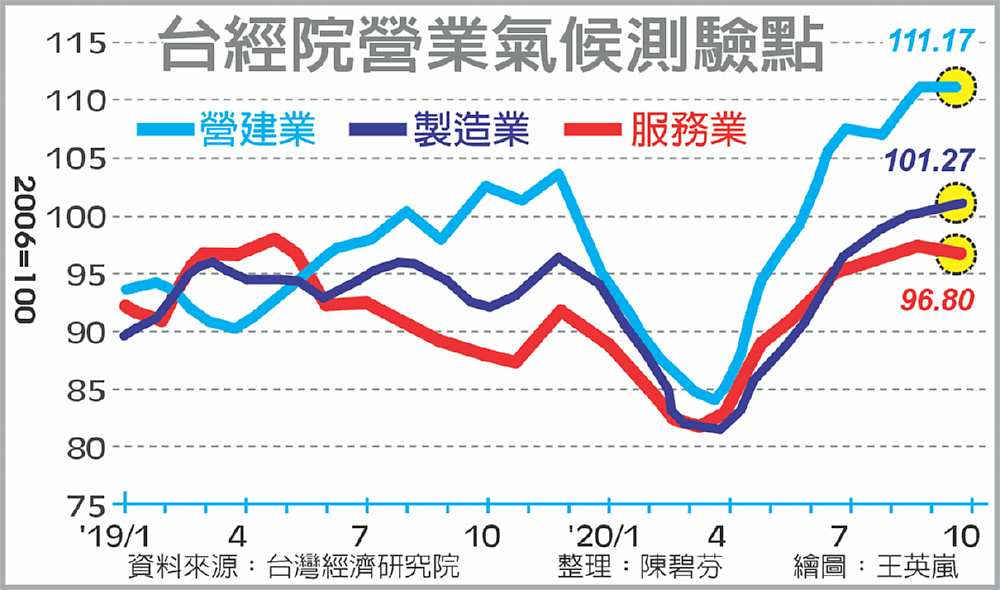 無畏國際疫情,台灣經濟景氣保有熱度,台灣經濟研究院25日公布三大產業10月廠商判讀景氣問卷調查,結果顯示服務業、營造業景氣居於高峰盤旋,製造業則在傳產全面跟進復甦下,製造業營業氣候測驗點出現連續第六個月上揚,大步跨過疫情前的水準,靠向2018年8月的近年高點。