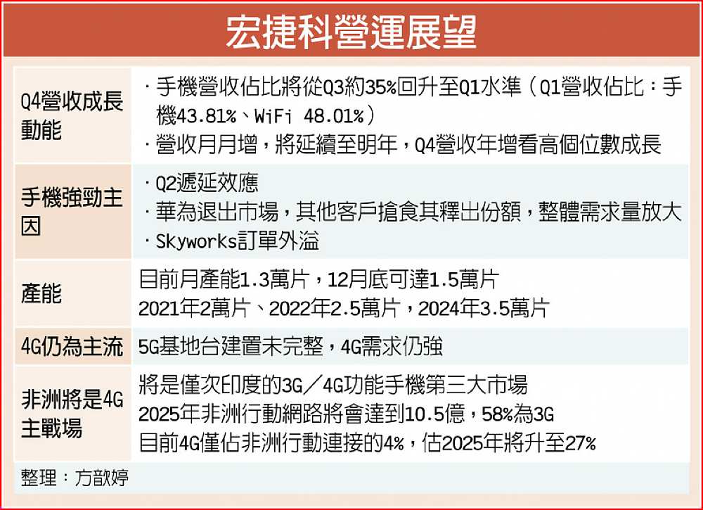 宏捷科表示,目前看來,智慧型手機後勁,主要由於第二季遞延效應,加上華為退出市場,其他客戶搶食其釋出份額,整體需求量放大,宏捷科預估,第四季的營收佔比將回到第一季水平,即WiFi與手機佔比各半。