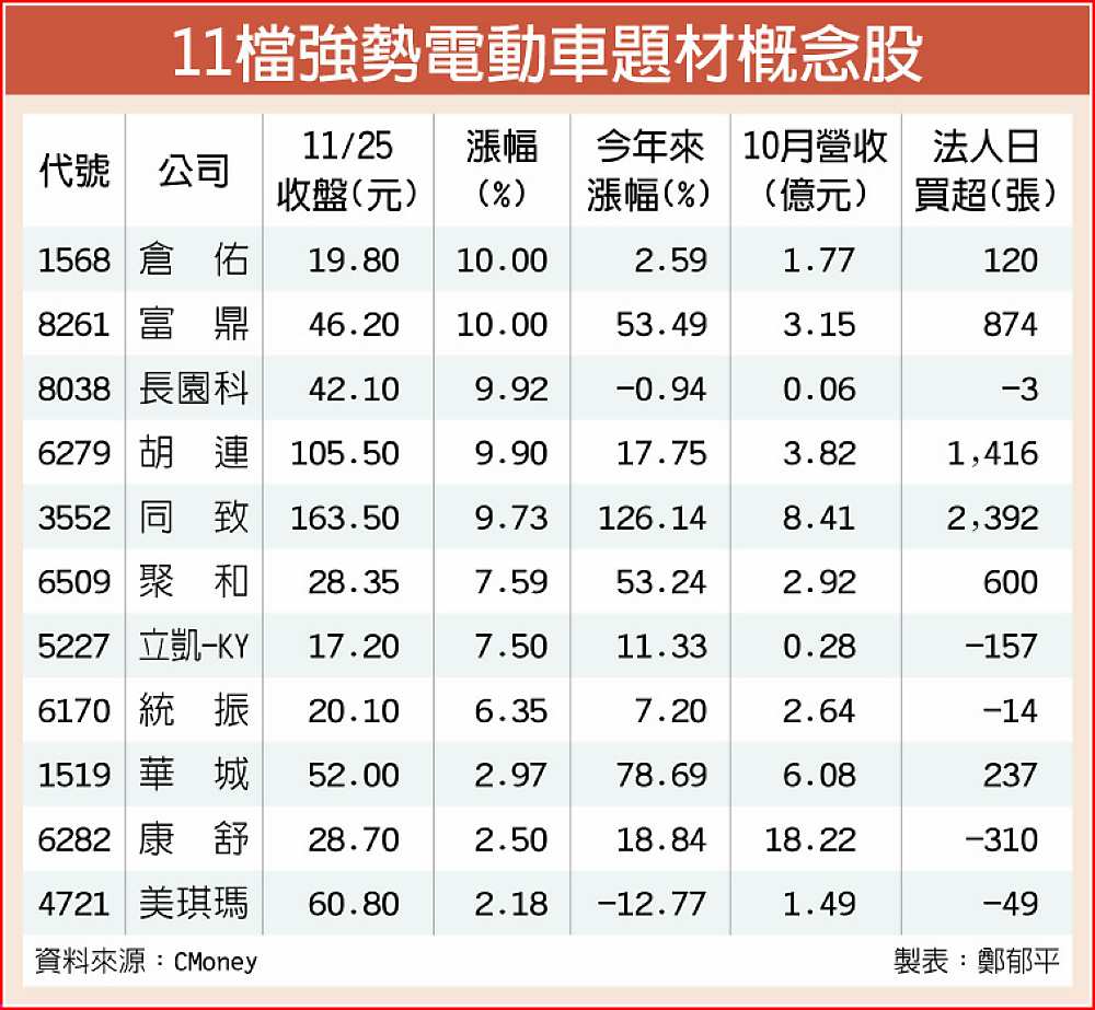 電動車大廠特斯拉確定納入標普500指數,加上大陸蔚來汽車財報數字優於預期,台股電動車概念股同步受惠,變速箱零組件廠倉佑(1568)、電池供應商長園科(8038)及特斯拉概念股同致(3552)等5檔個股連袂漲停。