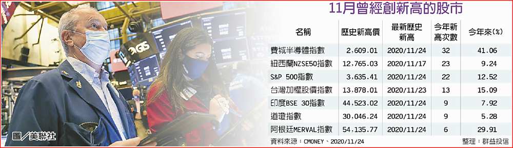 2020年11月美國總統大選底定,全球金融市場投資氣氛轉趨熱絡,全球主要股市計包括美國三大指數的費城半導體指數、S&P 500指數、道瓊指數,加上台灣、印度、紐西蘭、阿根廷共計七個股市11月都曾創下新高紀錄。