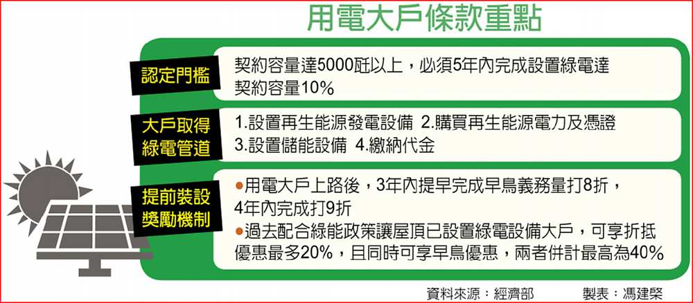 能源局官員說,用電大戶政策方向已訂出,過去討論四大內容原則不變,包含一、首波門檻維持5,000瓩;二、辦法實施前,先前配合能源政策已在屋頂設置再生能源發電設備者,訂定打折機制,義務量最高可減免20%;三、祭出早鳥優惠,業者需在五年內完成10%綠電設置,若提早在四年、三年內完成,建置比例可從10%降為9%、8%;四、不同再生能源類別,分別計算購買綠電額度。