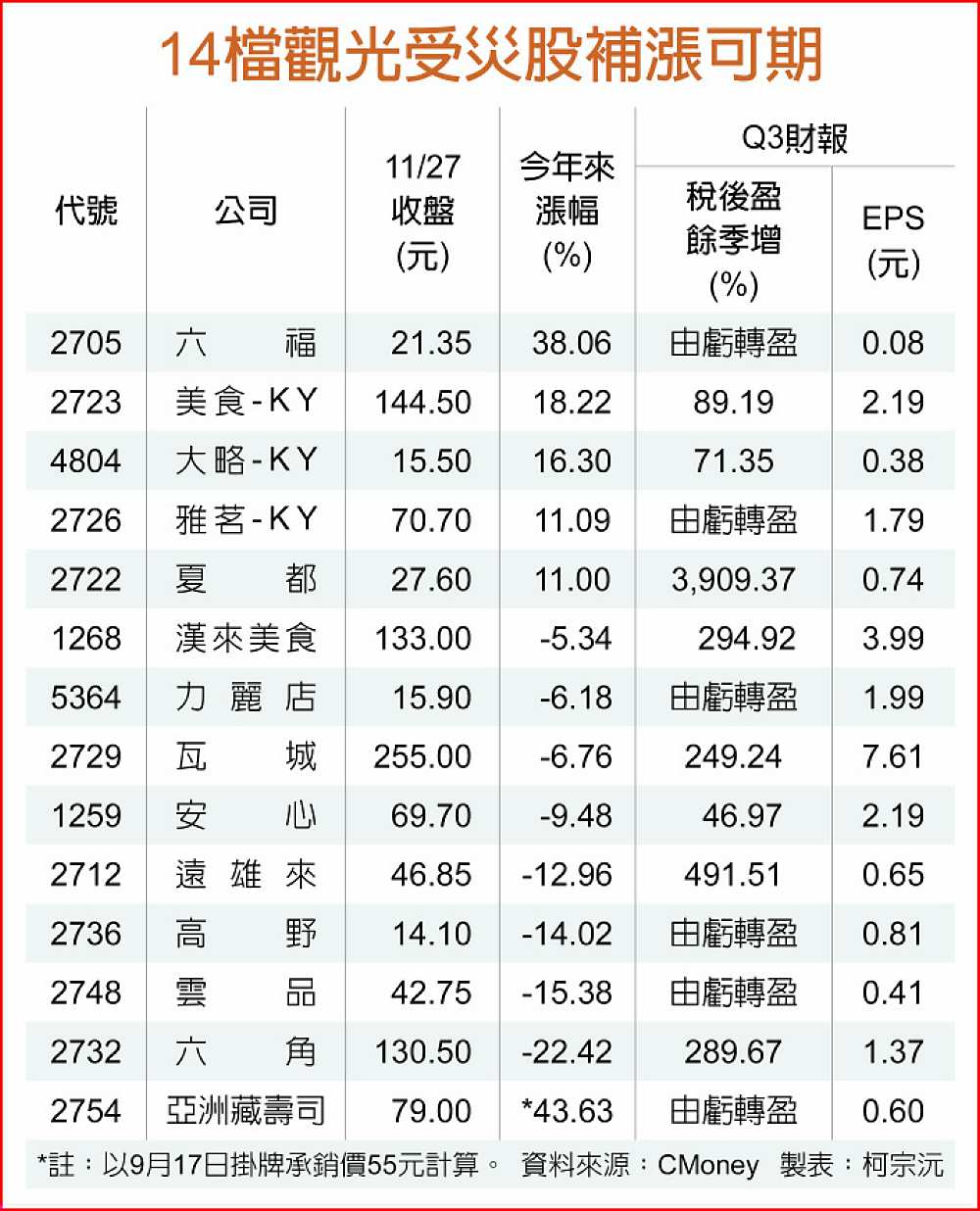 其中劍湖山透過私募強化營運結構,加上國旅政策助攻,上季度獲利暌違十季重返成長正軌;王品則在大陸疫情平穩後,當地事業群第三季營收季增45.75%,以及備戰年底的尾牙旺季,近期備受買盤青睞,股價27日再度亮燈漲停,2檔個股今年以來漲幅皆已大於六成,反觀其餘14檔個股基期相對偏低,相對更具補漲契機。