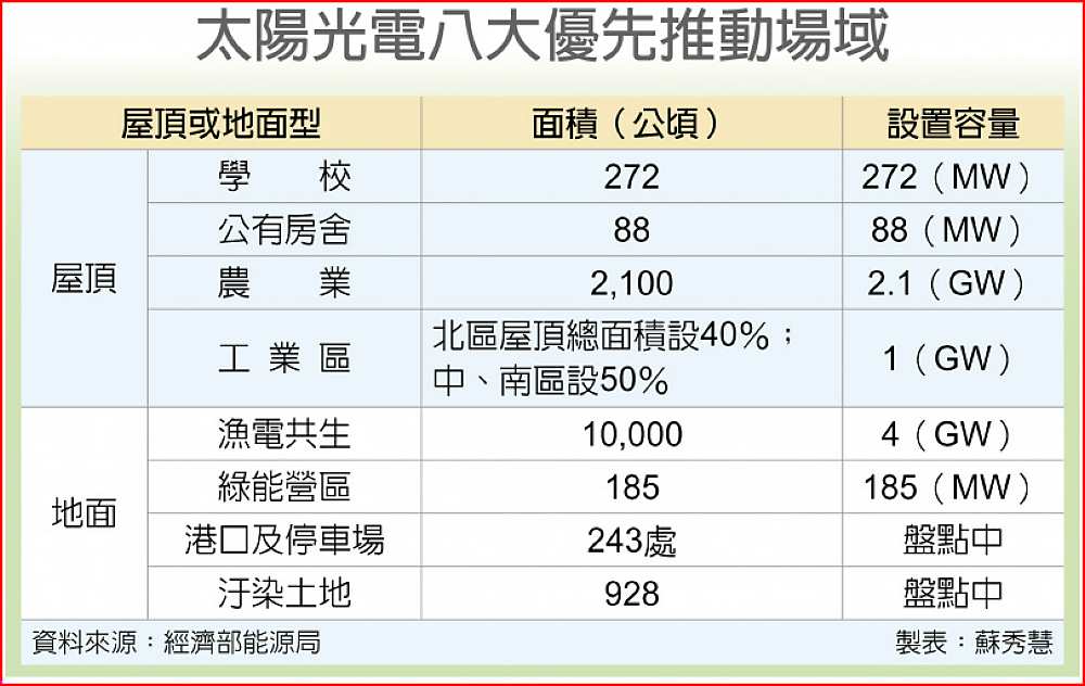 八大優先推動場域包括:學校、公有房舍、農業設施及工業園區等屋頂,漁電共生場域、綠能營區、港口及停車場、汙染土地。其中漁電共生面積較大,頗受光電業者青睞,大多分布在台南、嘉義、屏東、高雄、彰化和雲林地區。