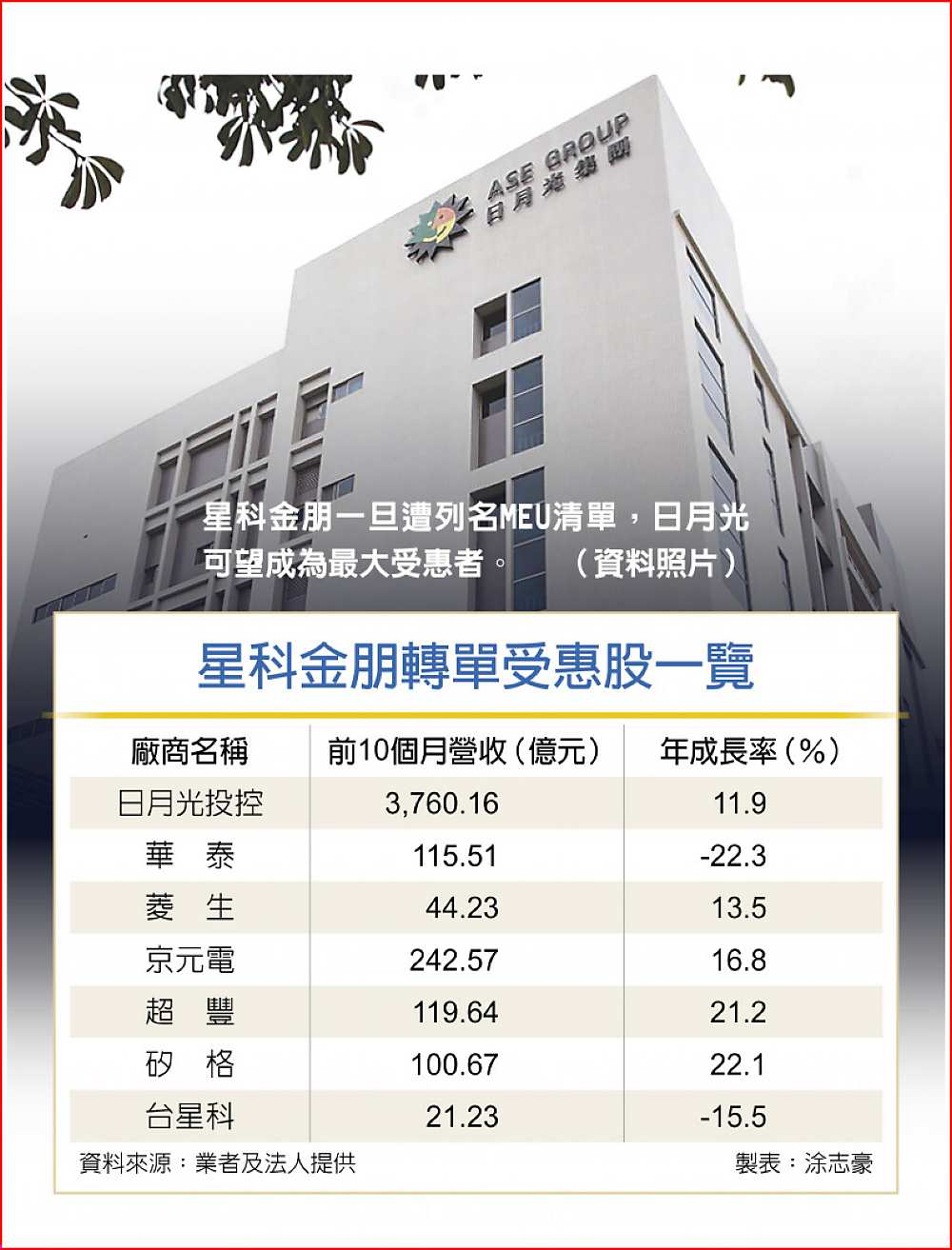 法人指出,星科金朋的主要客戶群都有與台灣封測廠合作,一旦列名MEU清單中,封測訂單恐會大舉轉單台灣,日月光投控將成為最大受惠者,大舉拿下蘋果、高通等大廠訂單,包括華泰、菱生、京元電、超豐、矽格、台星科等業者也將雨露均霑拿下更多訂單。由於封測產能已供不應求,訂單能見度看到明年第二季,星科金朋若受管制,封測產能全面吃緊及漲價效應恐將延續明年一整年。