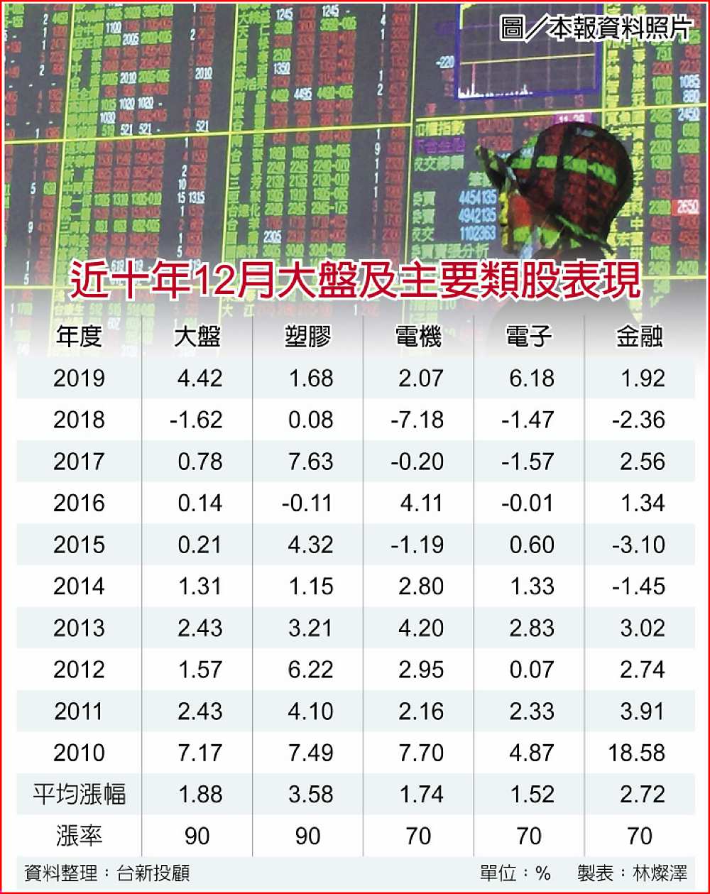 根據台新投顧彙整近10年(即2010年到2019年)之12月大盤指數,多達9個年度上揚(漲率達9成),平均大盤指數漲幅為1.88%;各類股中,塑膠類股漲率也是九成,紡纖、線纜、鋼鐵、航運等漲率為八成,電子、金融、電機、食品等漲率為七成,僅水泥及營建兩類股漲勢較緩,漲率各為六成、五成。電子、電機及金融等類股指數近10年之12月平均漲幅分別為1.52%、1.74%、2.72%,塑膠類股指數平均漲幅則有3.58%。