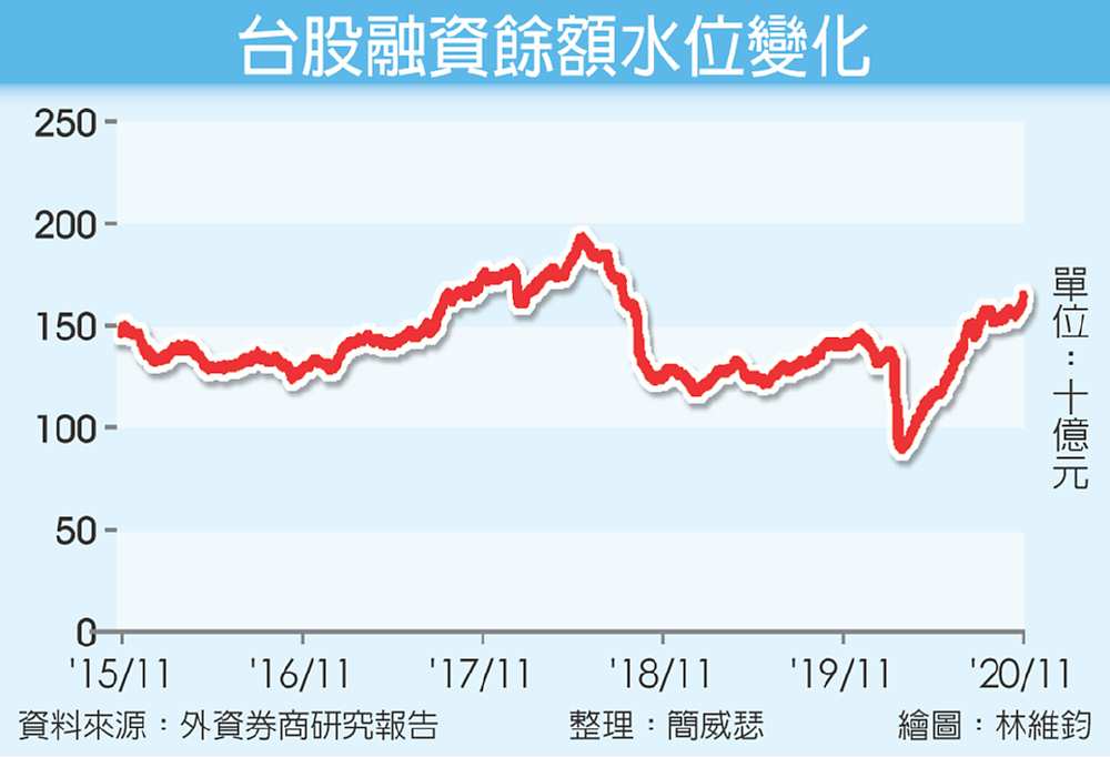 力挺台股的資金除了來自國際機構法人,發揮穩定台股結構的效用外,一般投資人也功不可沒。回顧上半年新冠肺炎初次大爆發時,融資餘額一度打到只有900億元左右,目前雖已回升至逼近1,700億元、波段增加逾八成,但里昂指出,與2018年中的前波融資餘額高點近2,000億元對照,目前融資餘額仍相對低。言下之意,暫時不存在市場所擔憂的融資餘額過高,使籌碼紊亂之問題。