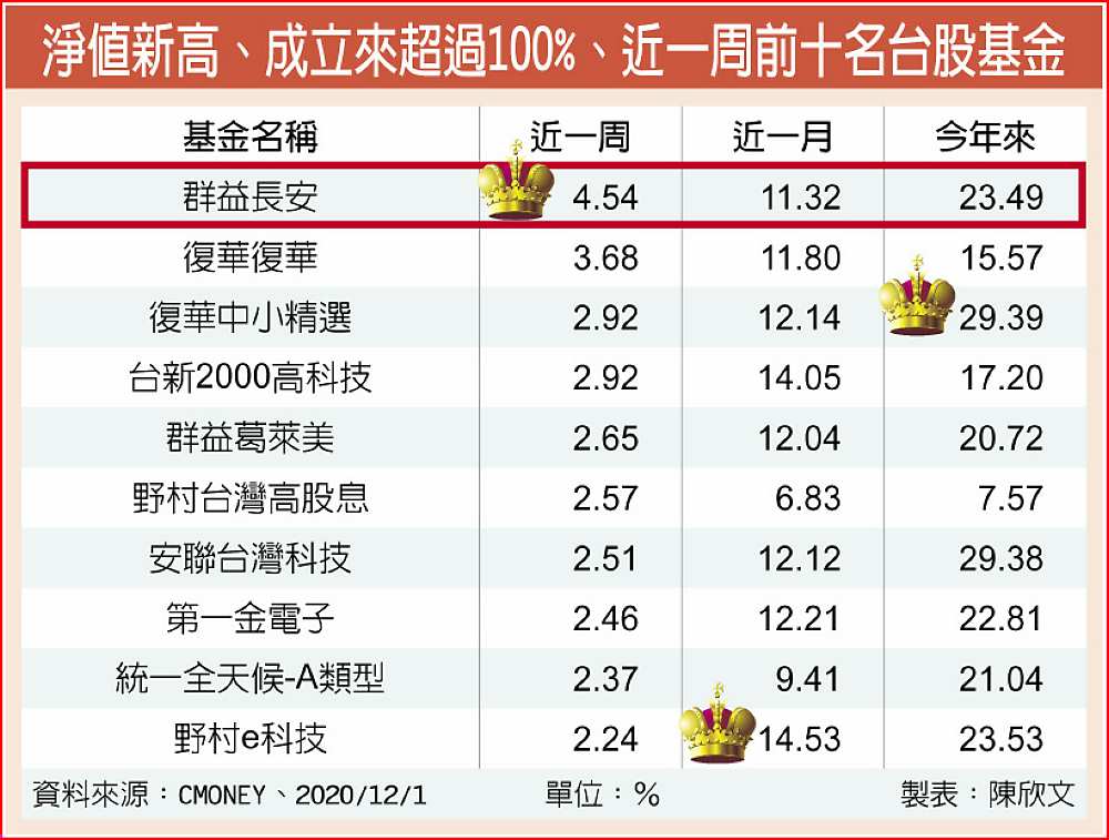 台股2日續創新高,大漲103.47點,收在13,989.14點,離一萬四千點關卡僅一步之差,統計2020年來上漲16.6%,創新高次數也高達15次。台股的頻創新高也讓台股基金績效紅通通,統計至12月1日止,148檔台股基金中共有67檔基金淨值創下新高,同時也讓19萬5,149位受益人投資都賺錢。